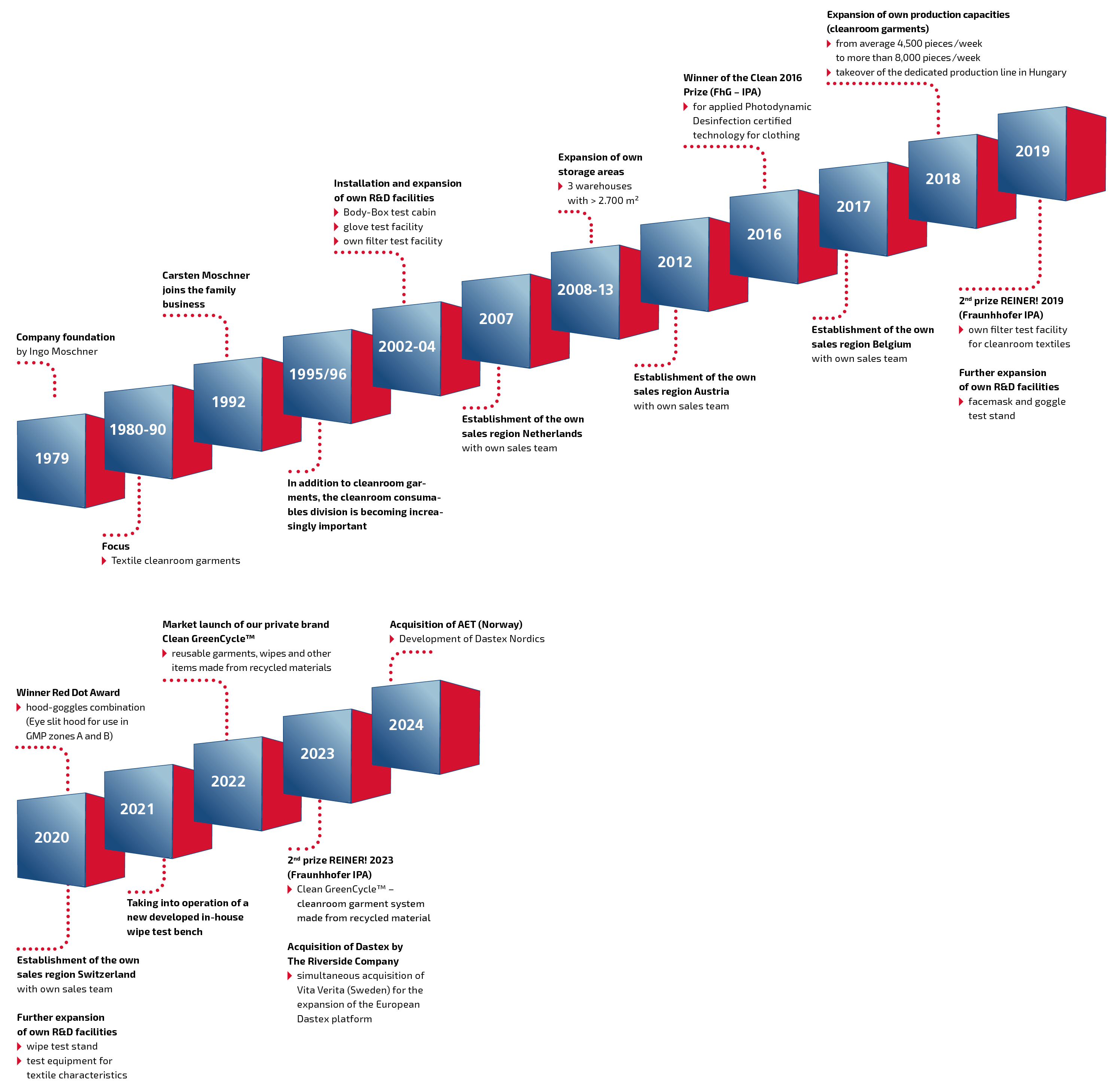 Dastex started in 1979 as a mere trading company in what was then a very young industry. The first products were mainly sourced from Japan and the USA and sold to cleanroom customers in German-speaking countries. However, it quickly became clear that an adaptation to European standards was necessary, which prompted us especially to take over the production of reusable cleanroom garments ourselves.
