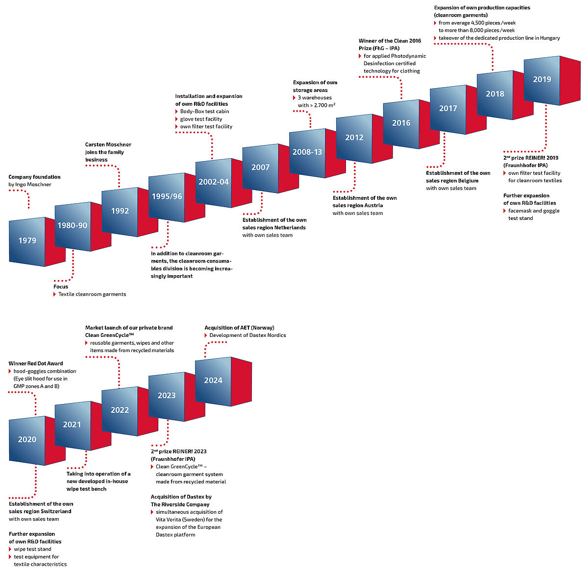 The indirect takeover successfully completed in mid-2023 of Dastex by The Riverside Company represents another milestone in the company's history. At the same time, Vita Verita, a leading player in the Swedish market, was also successfully acquired. The acquisition of the Norwegian service provider AET in April 2024 will gradually open up the Scandinavian markets. These strategic steps are aimed at establishing Dastex as the centrepiece of an ambitious pan-European growth strategy. Working closely with the management teams, Riverside aims to make Dastex the European small mid-cap market leader in contamination control for cleanrooms.