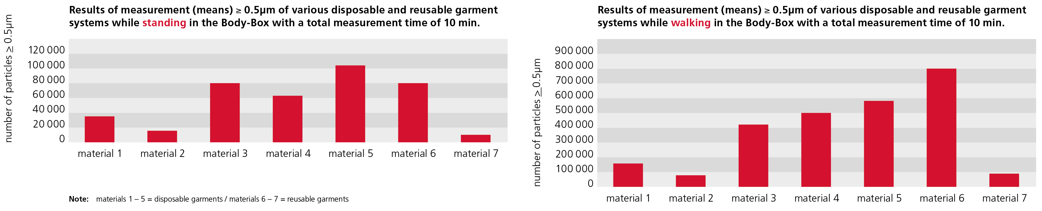 Certainly there are special areas of application where the use of cleanroom suitable disposable garments are still useful. It is important, however, that in critical areas (starting with class ISO 6 or better, or ISO 4) care should be taken to ensure that disposable garments have been appropriately decontaminated before packing. Only pre-cleaned disposable garments (material 2) are qualitatively, in terms of particle emission, comparable to decontaminated reusable garments (material 7).