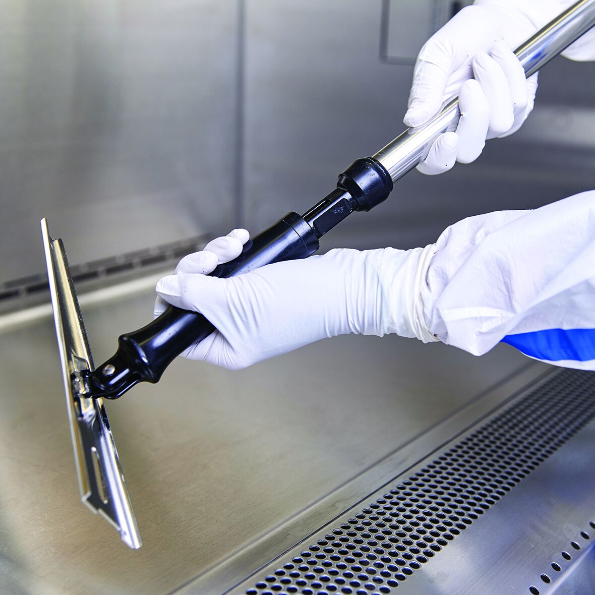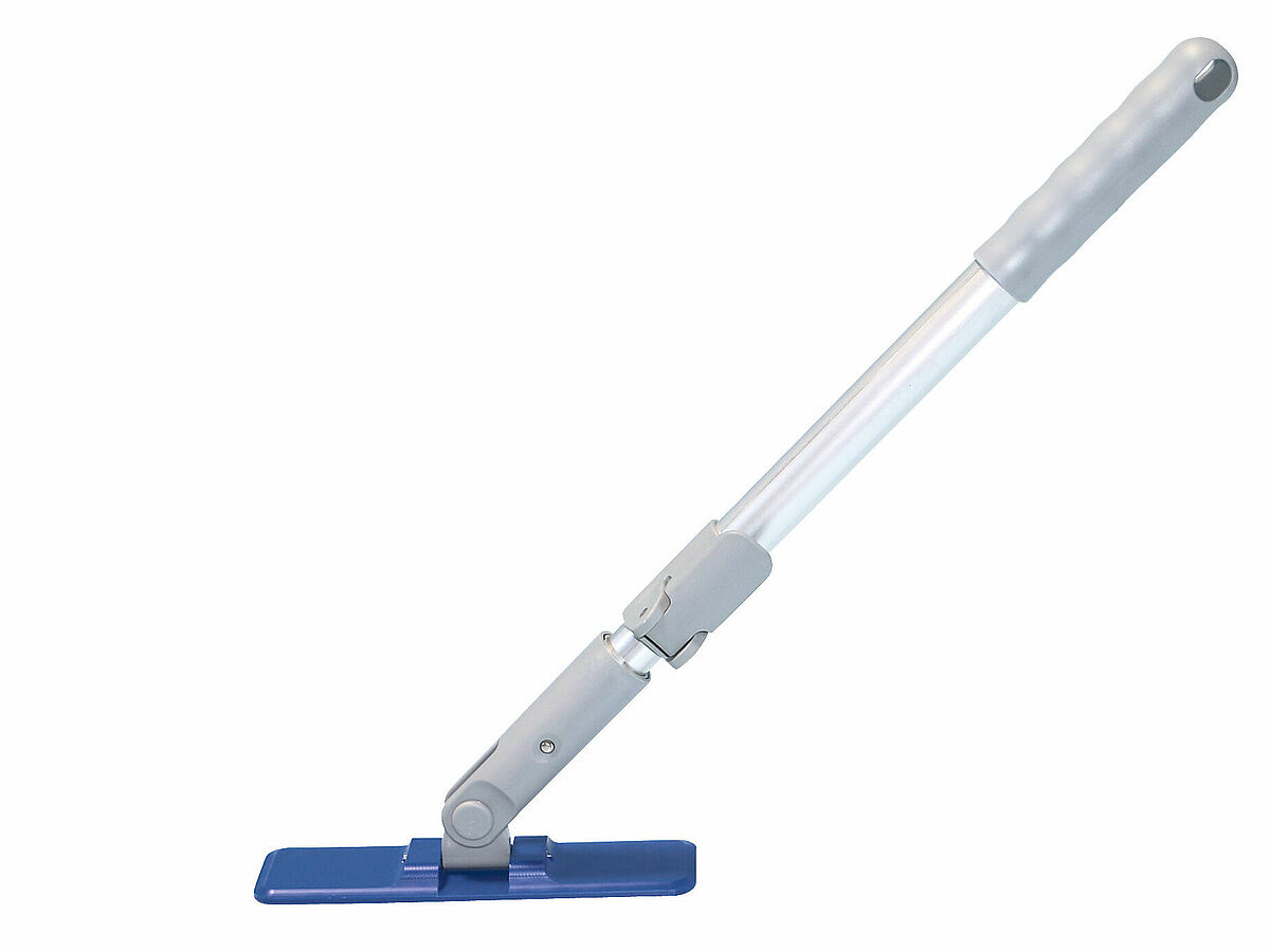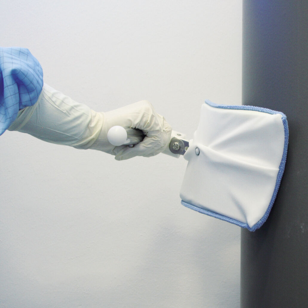 In addition to the classic wiping systems, special cleaning devices such as brooms and squeegees etc. serve as further supplementary components of the cleanroom cleaning system. These are usually available in various designs and colours.