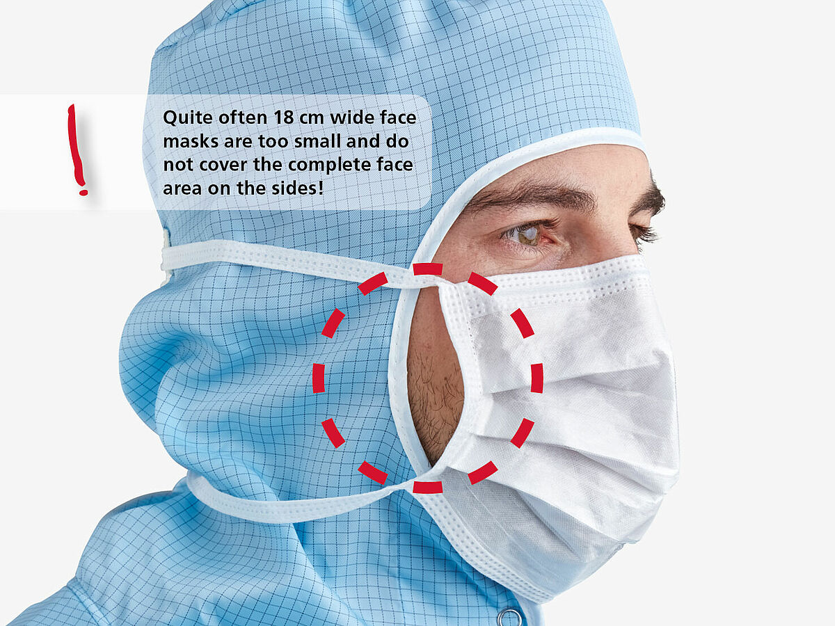 Reason: The sole purpose of these face masks is to limit the transfer of particulate and microbiological contaminants, which are emitted by the wearer, in cleanrooms/rooms of technical cleanliness, in such a way that primarily the product, but also its production environment, is not contaminated. This also explains the very high particle filtration efficiency (PFE) such as bacterial filtration efficiency (BFE) required by the cleanroom industry for these face masks.