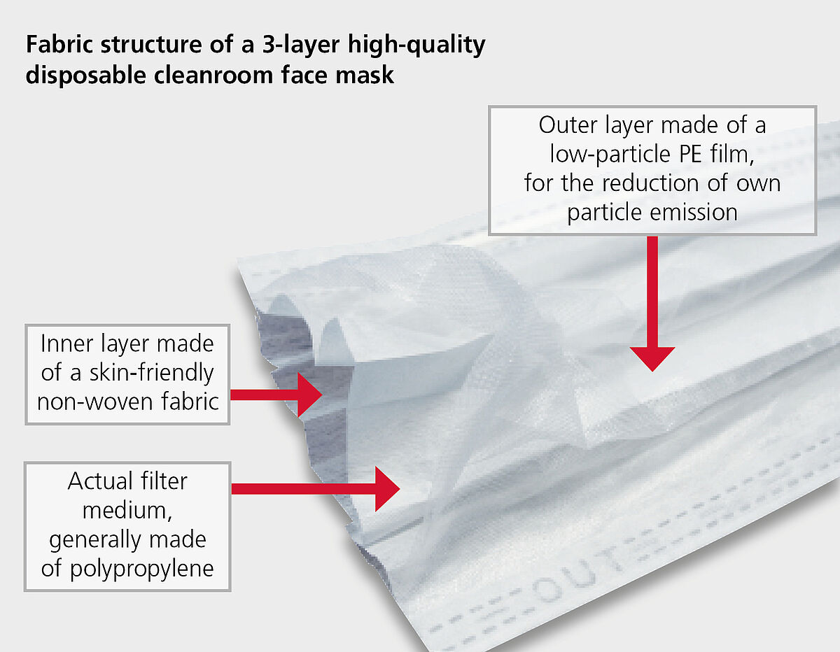 The listed non sterile face masks have a 3-layer construction made of cleanroom compatible fabrics.