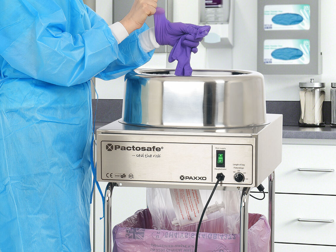 Waste bag film sealing device with foot pedal switch for safe disposal in hermetic bags. Safe intermediate storage of cytotoxic drugs for 7 days.