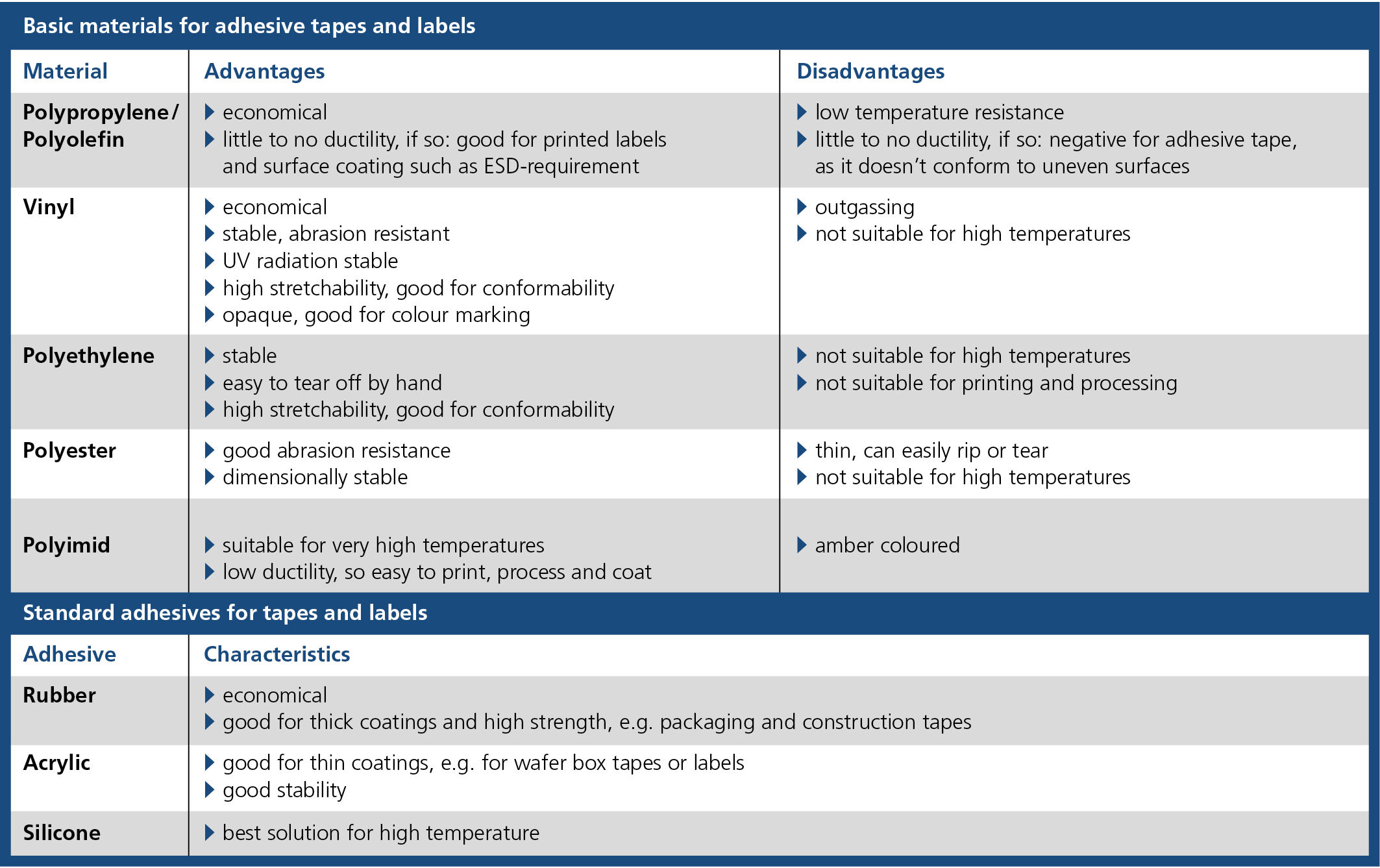 • autoclavability • ESD-suitability • high elasticity • high temperature consistency • tapes with special hazard warning print • double-sided adhesive area • tapes with indicator function for steam sterilisation • availability in different finishes |