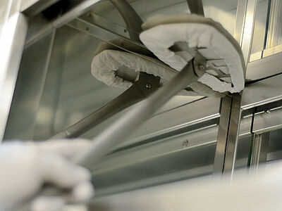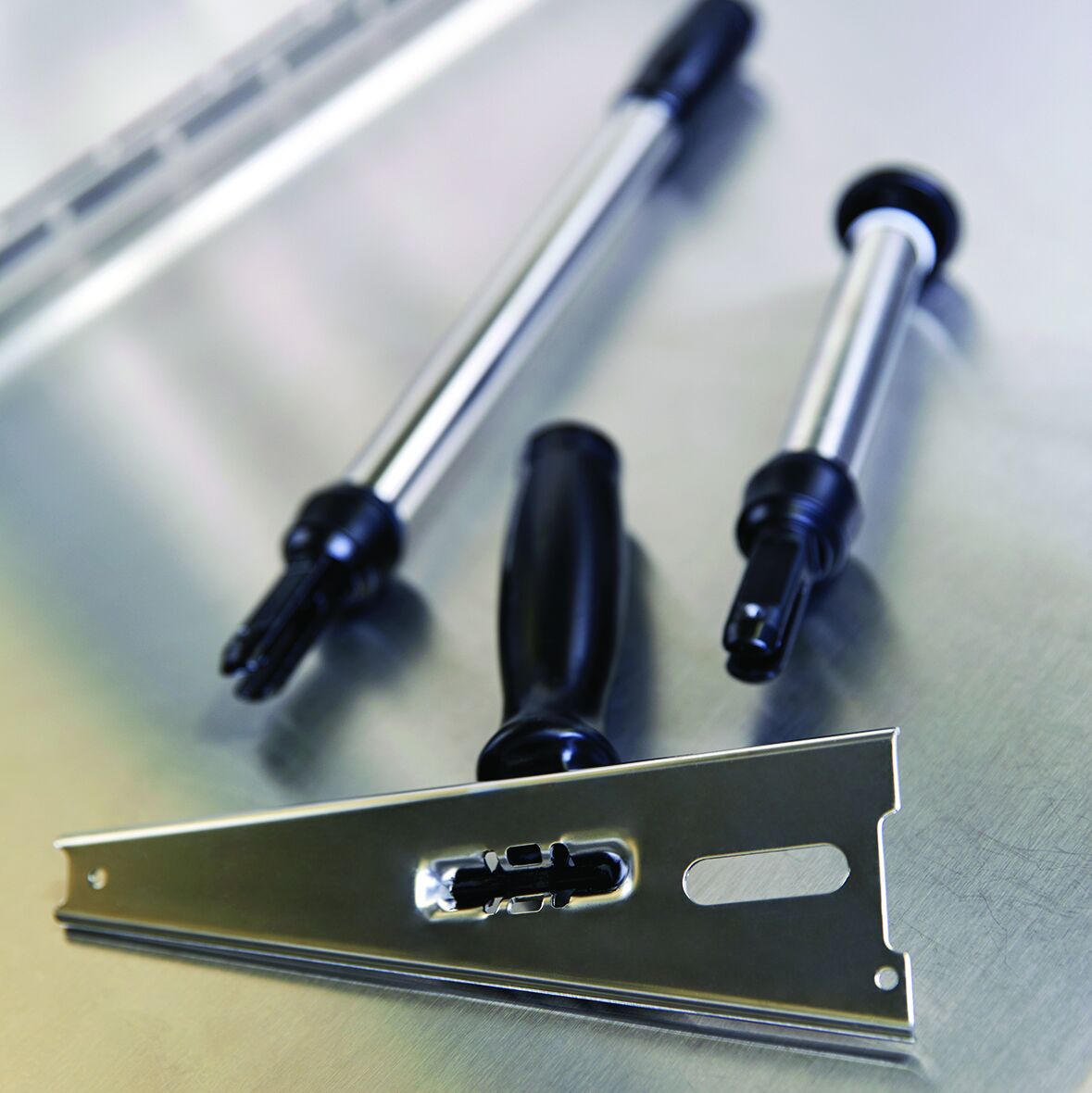 En plus des systèmes d'essuyage classiques, des dispositifs de nettoyage spéciaux tels que des balais et des raclettes, etc. servent de composants complémentaires au système de nettoyage salle propre. Ils sont généralement disponibles en différents modèles et couleurs.