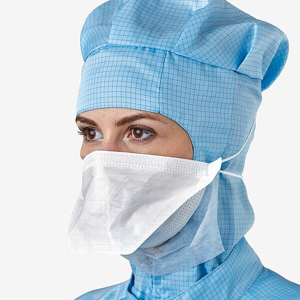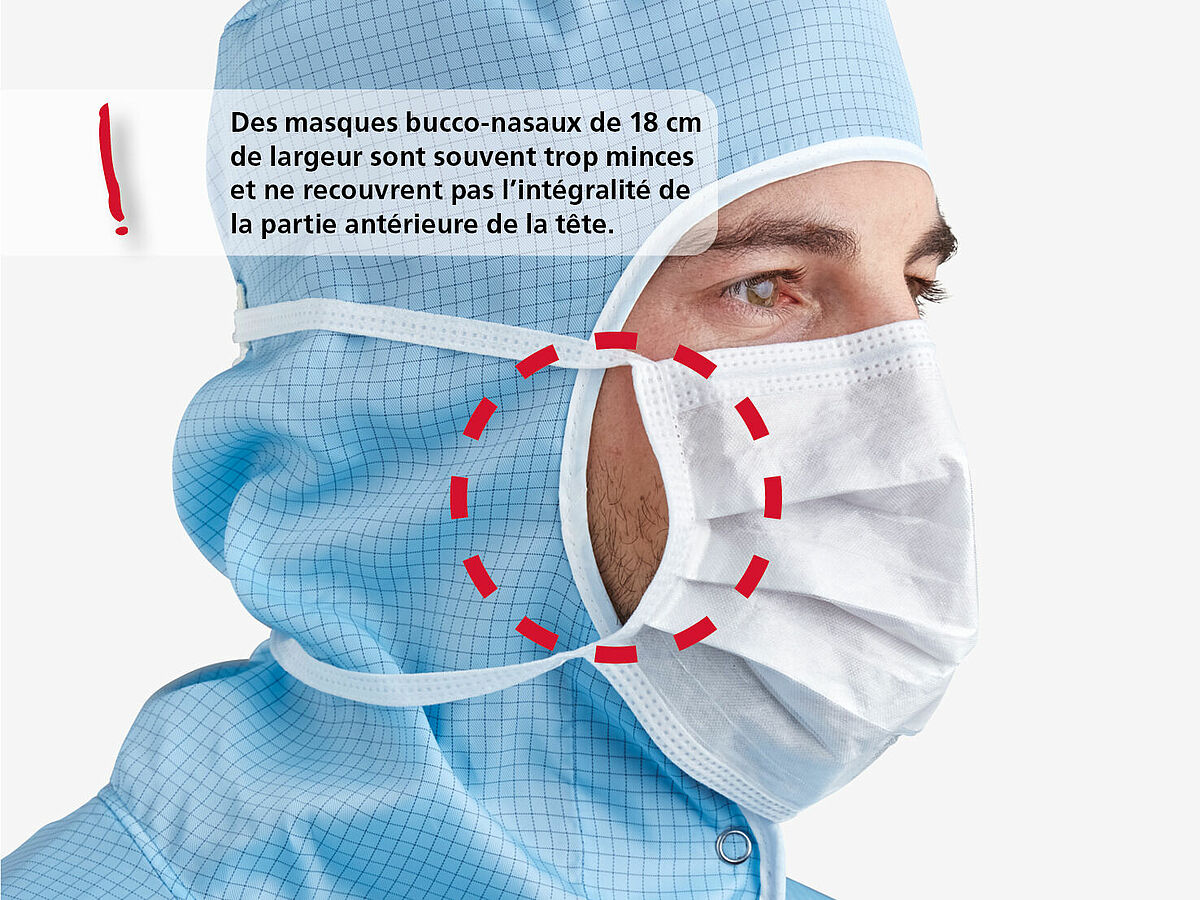 Justification: Le seul but de ces masques est de limiter le transfert d'impuretés particulaires et microbiologiques, qui sont diffusées par le porteur, dans les salles propres et de propreté technique, de manière à ce qu'en premier lieu le produit, mais aussi son environnement de production, ne soient pas contaminés. Cela explique conséquemment la très haute efficacité de filtration particulaire (PFE), comme l'efficacité de filtration bactérienne (BFE), exigée par l'industrie des salles propres pour ces masques faciaux.