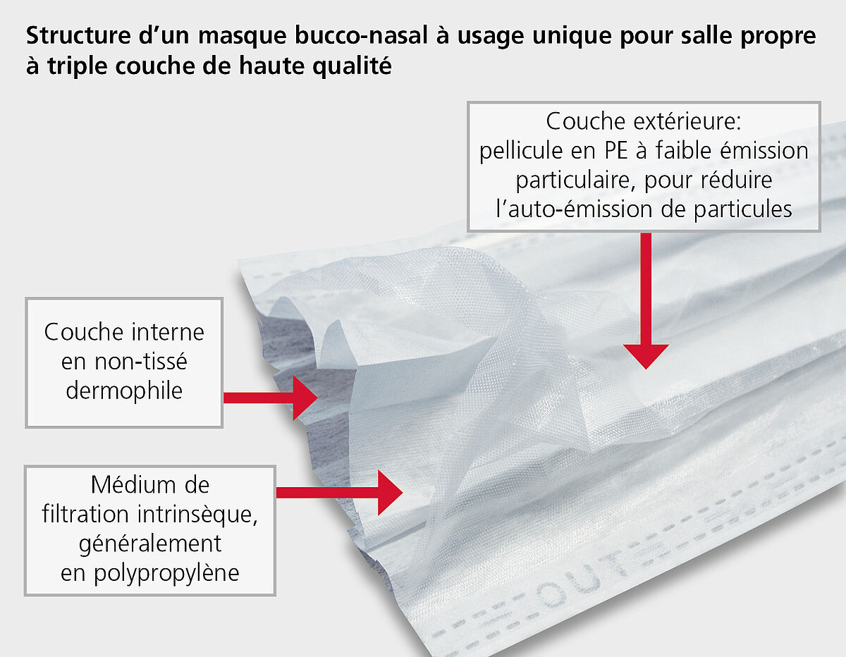 Un masque bucco-nasal à usage unique avec une efficacité de filtration acceptable se compose de trois couches de non-tissé: la couche centrale, un non-tissé produit selon un procédé spécial, est cruciale pour l'efficacité de la filtration. La couche qui fait face à la peau doit être douce et confortable à porter. La couche extérieure doit principalement protéger la couche filtrante du milieu contre les dommages. Tous les masques bucco-nasaux ont en commun un „pince-nez“/une barrette nasale flexible au centre du bord supérieur, qui, lorsqu'ils sont utilisés correctement, doivent contribuer à ce que le moins d'air non filtré possible puisse s'échapper vers le haut et par les côtés des narines.