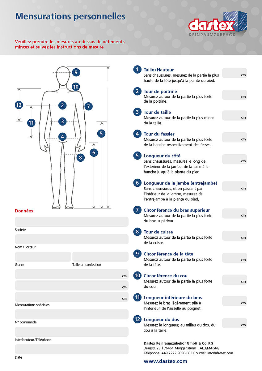 Les vêtements de dessus pour salles propres Dastex sont confectionnés, selon les exigences, à partir de différents tissus pour salle propre. Vous trouverez un aperçu des tissus utilisés par Dastex ainsi que leurs caractéristiques techniques au chapitre 1.2. Nos vêtements sont décontaminables et majoritairement stérilisables (autoclavables jusqu'à +134 °C, stérilisables par rayonnements gamma et/ou bêta). Fondamentalement, un rétrécissement du vêtement dans la limite des tolérances usuelles (lors de la décontamination par lavage, autant que lors de la décontamination par autoclavage) est possible. Au cas où les vêtements seraient à stériliser, leurs différents composants (par ex. les fermetures à glissière) doivent être adaptés au procédé de stérilisation. N’hésitez pas à nous contacter avant de passer commande!