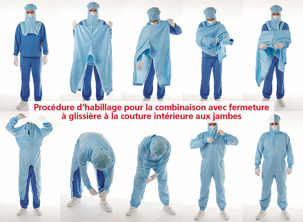 - Boutons-pression pour fixation aux manches / à la taille ou aux jambes de pantalon afin d‘éviter un contact au sol lors de la procédure d‘habillage