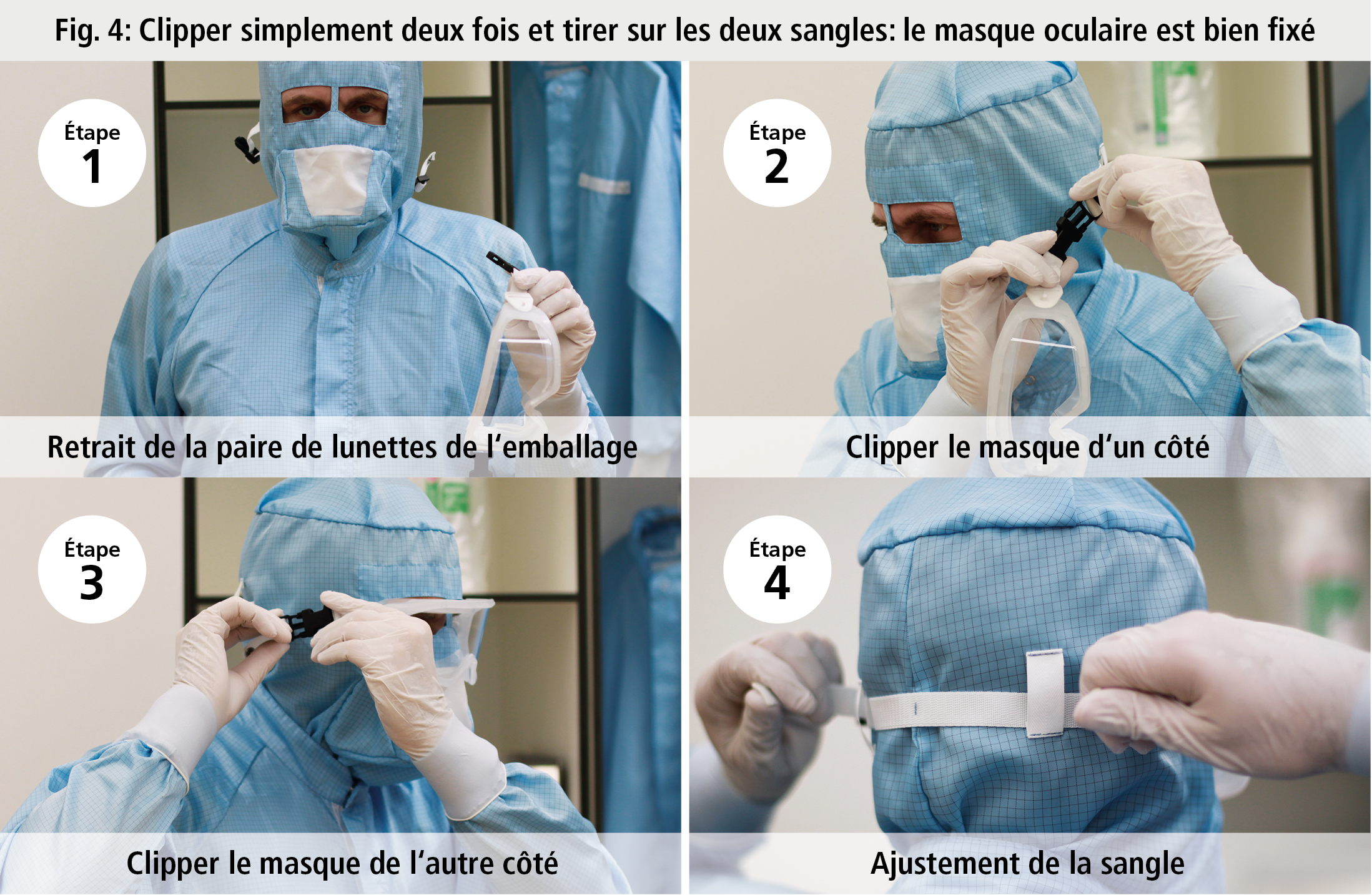 En termes de maniabilité, l'objectif est de fournir aux porteurs des solutions qui rendent la procédure d'habillage aussi simple que possible. En même temps, le risque résiduel de contamination supplémentaire pendant la procédure d'habillage doit être minimisé autant que possible. Si les traces de pression sur le visage peuvent également être réduites dans ce contexte, il s'agit d'un effet secondaire positif.