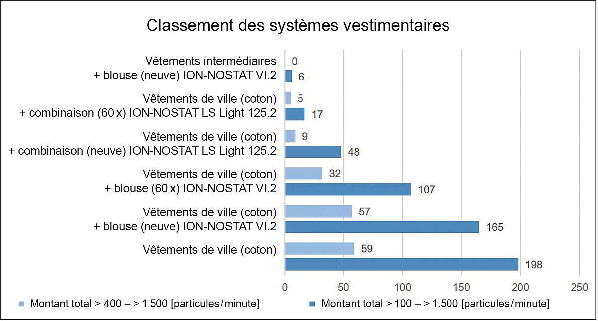 Comme l'illustre le classement des systèmes d'habillement (cf. photo), avec 0 - 6 particules/minute (en fonction de la plage de tailles des particules), le moins de particules a été détecté lors de l'utilisation d'une blouse de laboratoire en ION-NOSTAT VI.2 en combinaison avec un sous-vêtement de salle propre. Ces valeurs sont suivies de près par celles de l'ensemble ION-NOSTAT LS Light 125.2 avec 5 -48 particules/minute (selon la gamme de tailles des particules). En même temps, le textile offre un très grand confort de port. Comme prévu, les vêtements de ville émettent le plus de particules, respectivement avec 59 et 198 particules/minute. Il convient de préciser qu'il s'agissait d'un jogging en coton fraîchement lavé, porté uniquement dans la Body-Box. Avec des vêtements de ville normaux, il faut s'attendre à un niveau de contamination particulaire nettement plus élevé. Ici, s'ajoutent la saleté de la rue, la contamination, par exemple par les animaux domestiques, et bien d'autres. Toutes ces particules tombent du bas de la blouse de laboratoire, c'est pourquoi les valeurs de particules des vêtements de ville + blouse de laboratoire sont élevées, de l'ordre de 32 à 165 particules/minute, et ce malgré le tissu de salle propre de haute qualité ION-NOSTAT VI.2. Les contaminants qui tombent ne se déposent pas automatiquement sur le sol et n'y restent certainement pas immobiles. Selon le type de particule, les particules restent longtemps en suspension dans l'air. En raison des mouvements, tels que les déplacements du personnel, les flux d'air, etc., les particules sont remuées avec les flux d'air et peuvent se déposer sur les zones de travail et donc sur les produits. L'utilisation d'une version vêtements de ville-plus-blouse de laboratoire est donc fortement déconseillée au-delà d'un certain niveau de propreté requis.