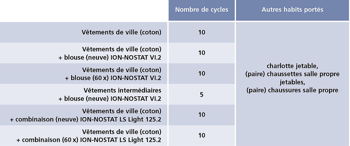 Pour la blouse, on a délibérément choisi un textile de salle propre recommandé pour les classes de propreté de l'air EN ISO 14644-1 4 et moins, et pour la combinaison (overall), un tissu de salle propre pour les classes 8 + 9. L'objectif est de montrer comment se comporte une combinaison offrant un meilleur confort de port par rapport à une blouse de laboratoire offrant une meilleure efficacité de filtration. L'étude montrera l'influence que la forme de la coupe peut avoir sur la propreté. L'étude montrera également comment les vêtements intermédiaires de salle propre, lorsqu'ils sont portés sous une blouse de laboratoire au lieu de vêtements de ville, peuvent influer sur le degré de risque de contamination.