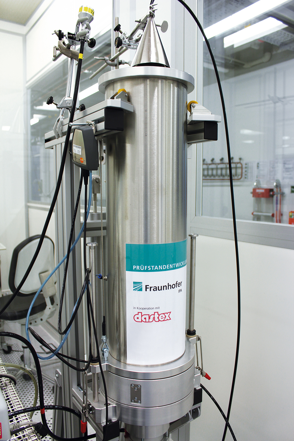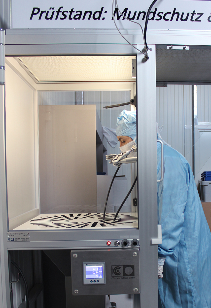 En coopération avec la société CCI von Kahlden GmbH, un banc d'essai a été finalisé en 2018, à l'aide duquel des enquêtes sur les lunettes salle propre et les masques bucco-nasaux peuvent être menées.