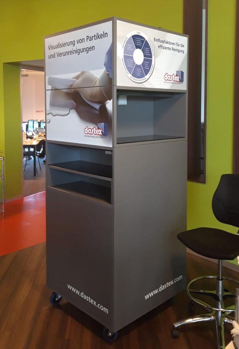 Le nouveau banc d'essai est basé sur la méthode standardisée Gelbo-Flex, mais a été modifié en conséquence à différents endroits en ce qui concerne l'objectif (libération de particules et de fibres sous charge mécanique). Avec l'aide du nouveau banc d'essai, Dastex a l'intention d'étudier et d'évaluer une grande variété de lingettes de nettoyage pour salle propre en ce qui concerne leur libération inhérente de particules à l'état sec, dans des conditions plus proches de la pratique que celles qui étaient disponibles jusqu'à présent. Le banc d'essai est conçu de telle manière que d'autres produits (ou leurs surfaces) peuvent également être testés dans des conditions similaires en termes de dégagement de particules, comme des housses de balais-serpillières, des gants (principalement en textile), des chaussettes, diverses qualités de papier, des matériaux d'emballage, etc.