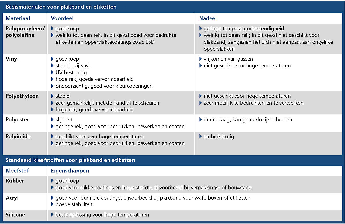 De selectie van het basismateriaal en de kleefstof speelt hierbij al een doorslaggevende rol. Hierna volgen enkele voor- en nadelen van de verschillende basismaterialen en eigenschappen van de kleefstof die kunnen helpen bij het maken van uw keuze.