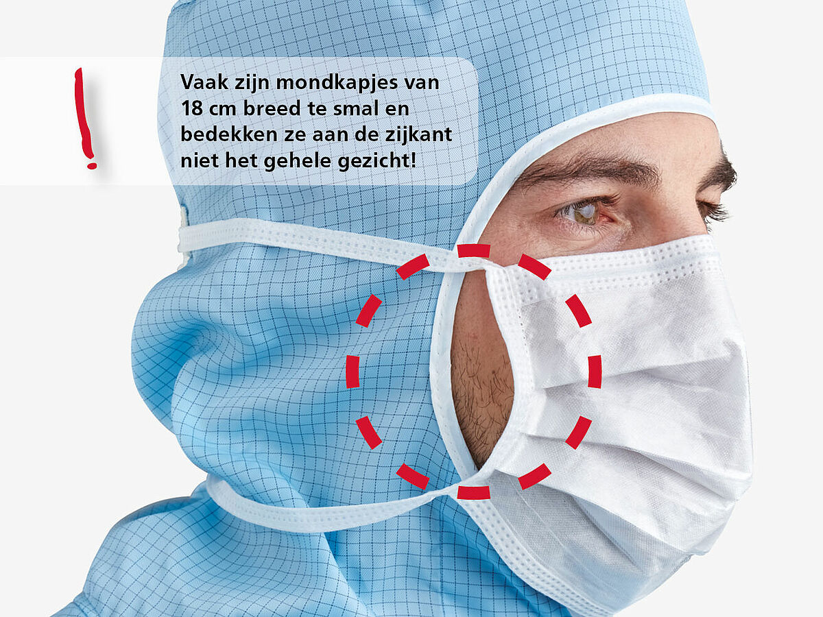 Achtergrond: Onze gezichtsmaskers zijn uitsluitend bedoeld om de overdracht van door de drager afgescheiden deeltjes en microbiologische verontreinigingen in schone ruimten en cleanrooms zodanig te beperken dat in de eerste plaats het product, maar ook de productieomgeving niet wordt verontreinigd. Dit rechtvaardigt ook de zeer hoge deeltjesfiltratie-efficiëntie (PFE) en bacteriefiltratie-efficiëntie (BFE) die de cleanroom-industrie verplicht stelt voor gezichtsmaskers.