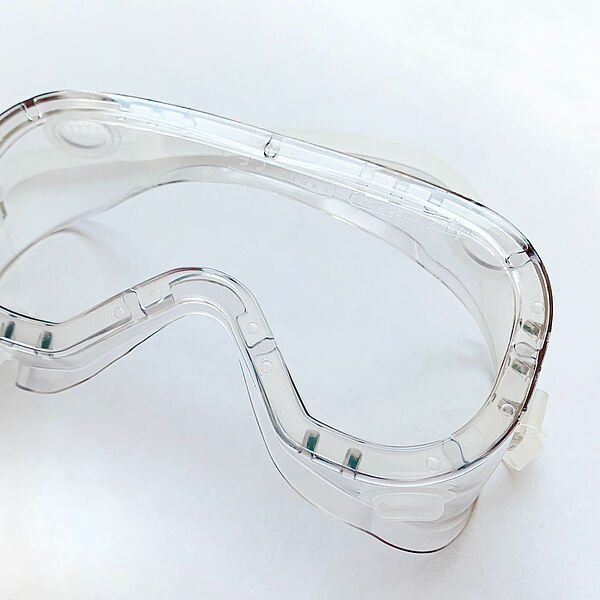 verstelbaar bandje van clean-isopreen, vrij van stof, microben en kiemen, overloopkanaal voor vloeistoffen, kan over een bril gedragen worden, één maat voor iedereen, flexibel PVC frame met indirecte ventilatie aan de boven- en onderkant, panoramisch gezichtsveld