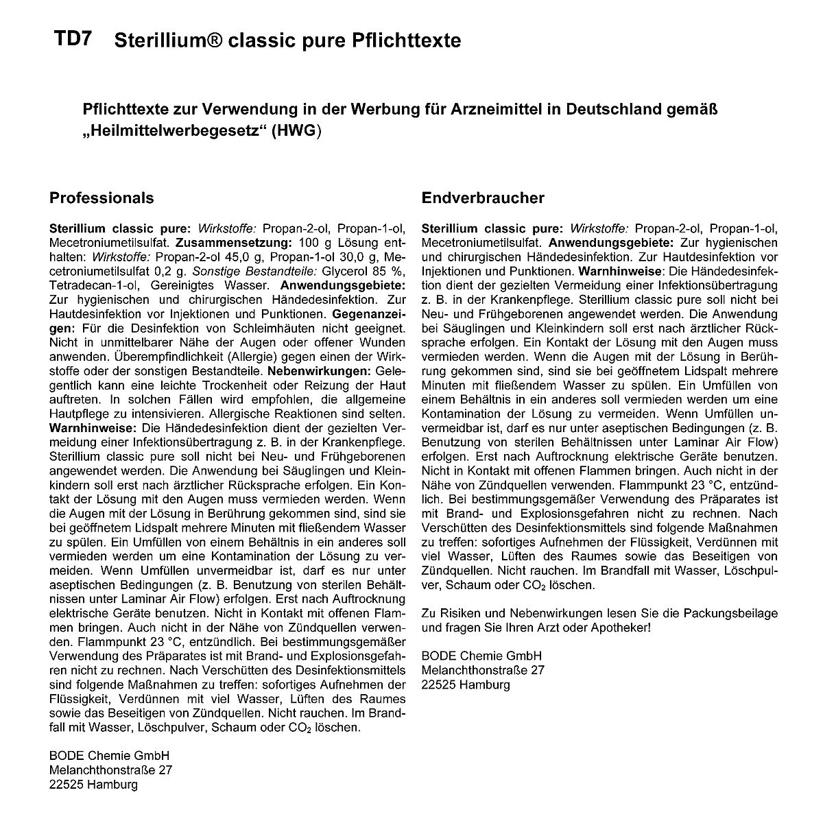 Der Klassiker als farbstoff- und parfümfreie Variante. Wirkspektrum: Bakterizid, levurozid, mykobakterizid, begrenzt viruzid, Adeno-, Polyoma- und Rotavirus. Hinweis: VAH gelistet.