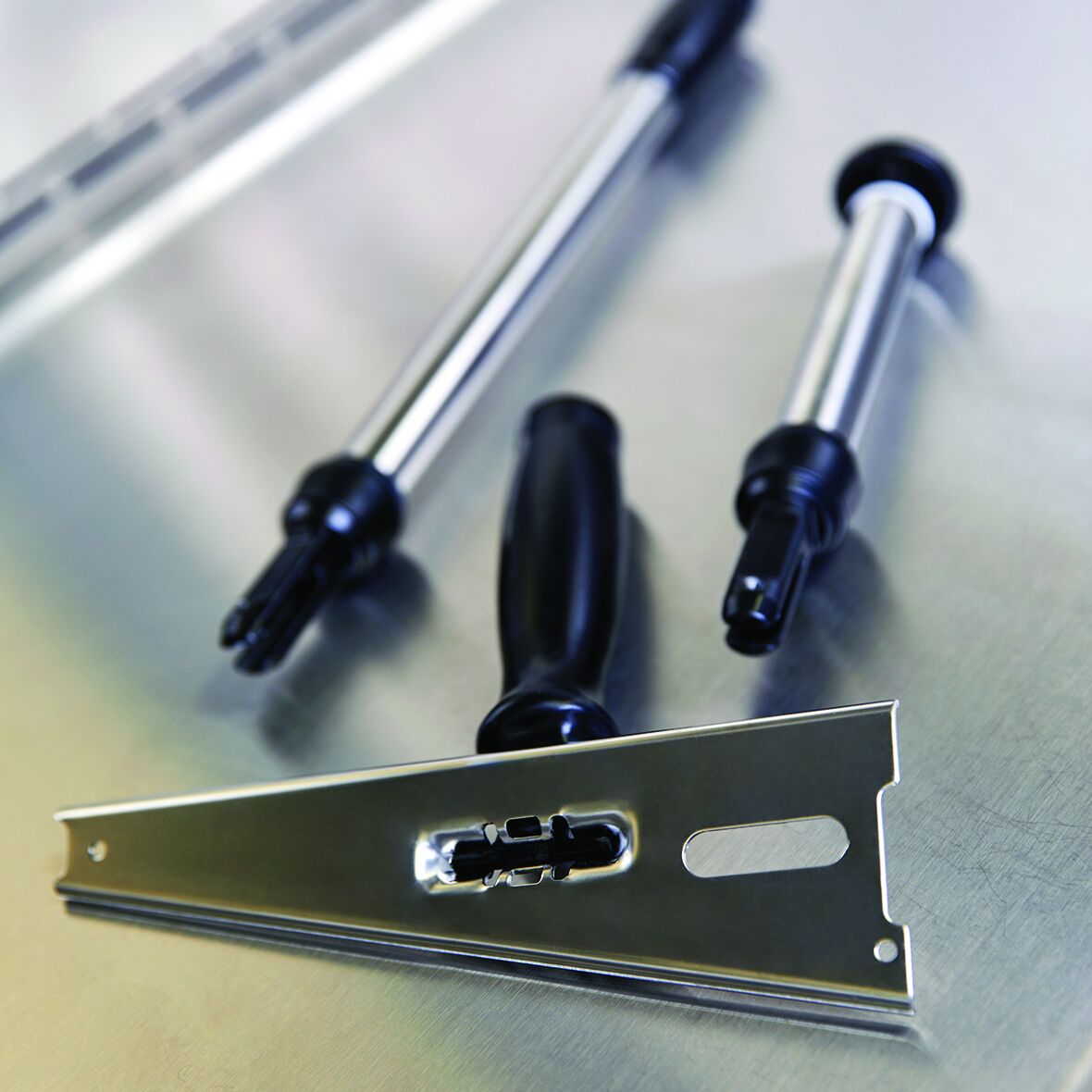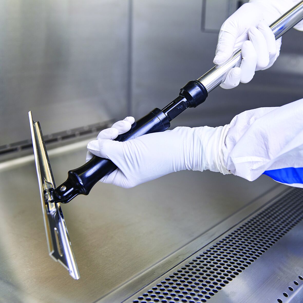 Neben den klassischen Wischsystemen dienen spezielle Reinigungsgeräte, wie Besen und Abzieher etc. als weitere ergänzende Bestandteile des Reinraum-Reinigungssystems. Diese sind in der Regel in verschiedenen Ausführungen und Farben verfügbar.