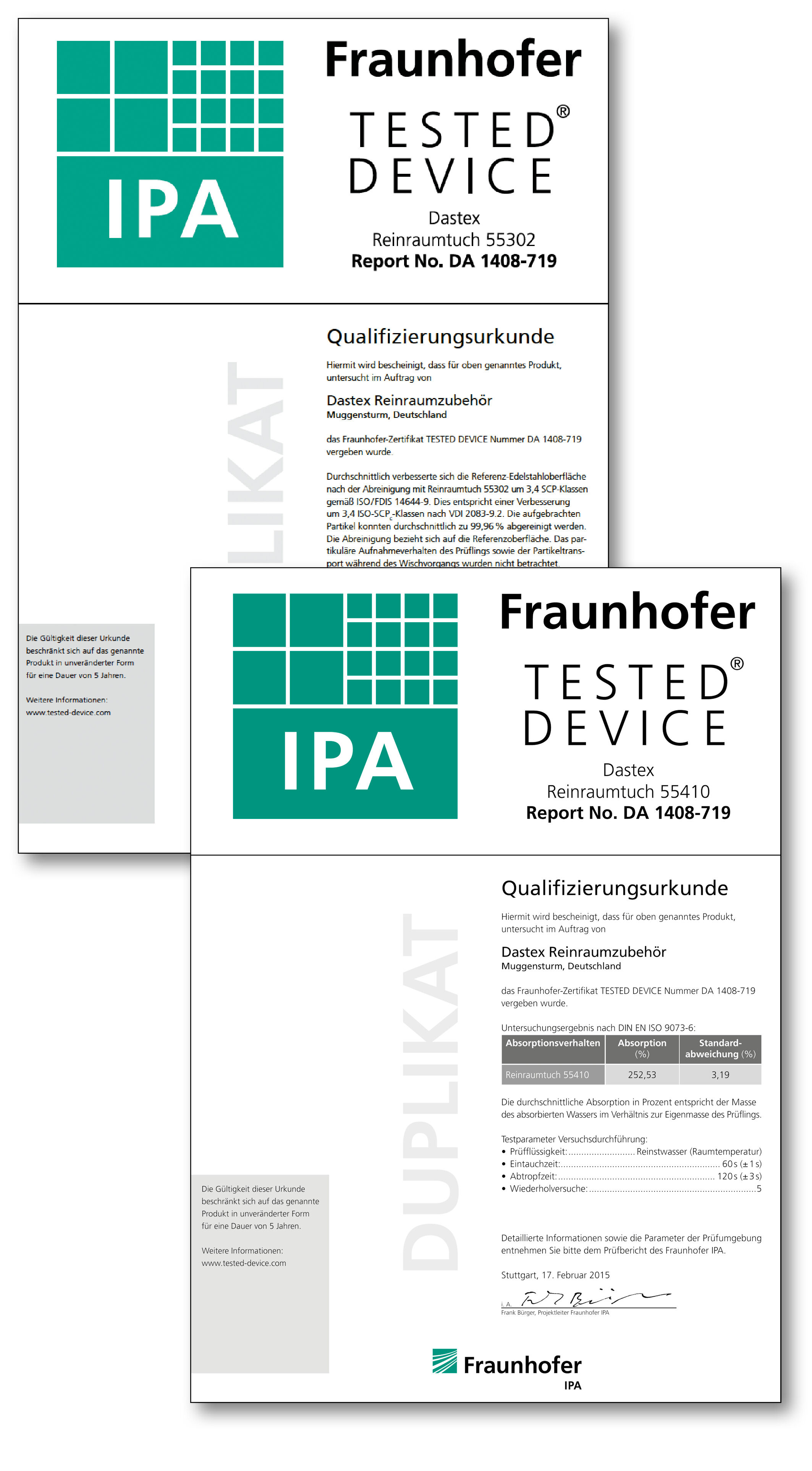 Um unseren Kunden auch weiterhin im Produktbereich Reinraum-Reinigungstücher qualifiziert beratend zur Seite zu stehen, hat Dastex für eine größere Auswahl an Tüchern eine umfangreiche Studie bei dem international renommierten Fraunhofer-Institut für Produktionstechnik und Automatisierung IPA (Stuttgart) in Auftrag gegeben.