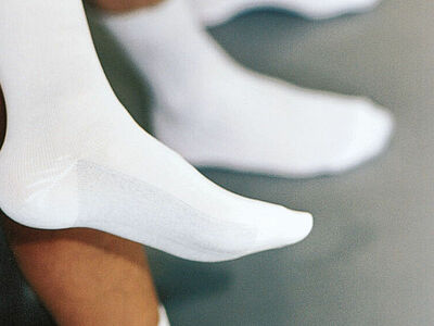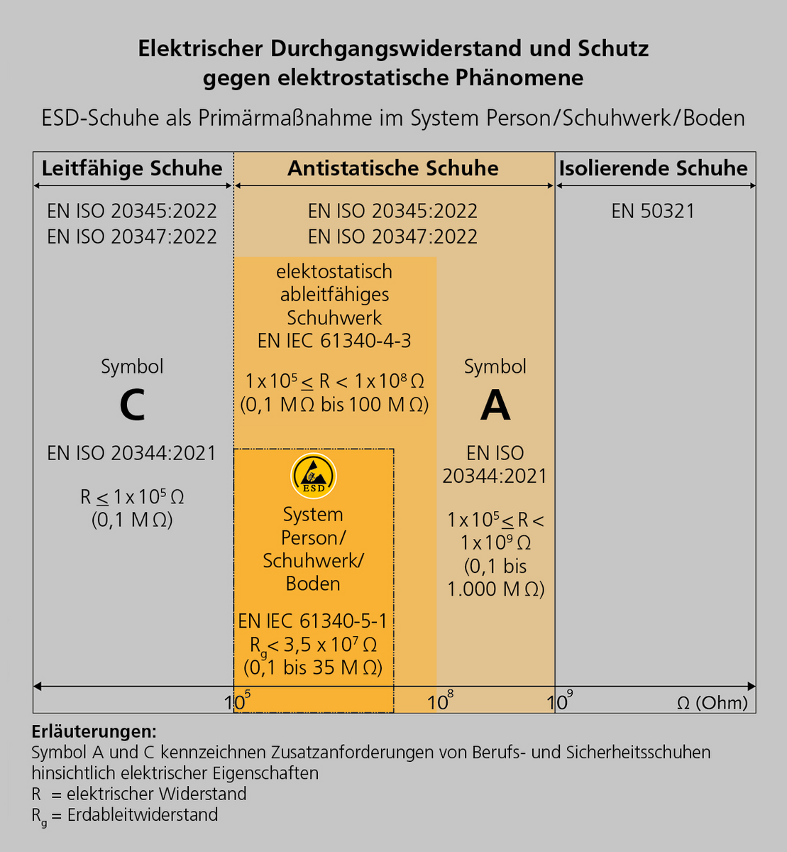 Durch das Tragen von sog. ESD-Schuhen sollen Spannungsdurchschläge zwischen dem Träger und seinem Umfeld verhindert werden. Gemäß Norm EN 61340-5-1:2016 soll der Durchgangswiderstand unter 3,5 x 107 Ohm liegen.
