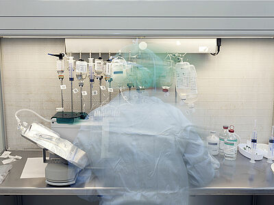 GMP-konformes Einschleusen und Arbeiten: sterilisierte Zytostatika-Schutzverpackungen für Transport, Lagerung, Transfer zum Patienten und den internen, sterilen Transport.