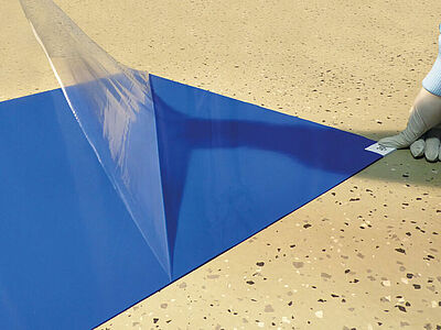 Als letztes wird nun auch von der 4. Ecke aus die oberste Folien in Richtung Mattenmitte abgezogen. Fassen Sie die größtenteils abgelöste Folie in der Mitte zusammen. Sie kann nun vorsichtig entfernt werden, ohne dass sie reißt und ohne dass Staub freigesetzt wird.