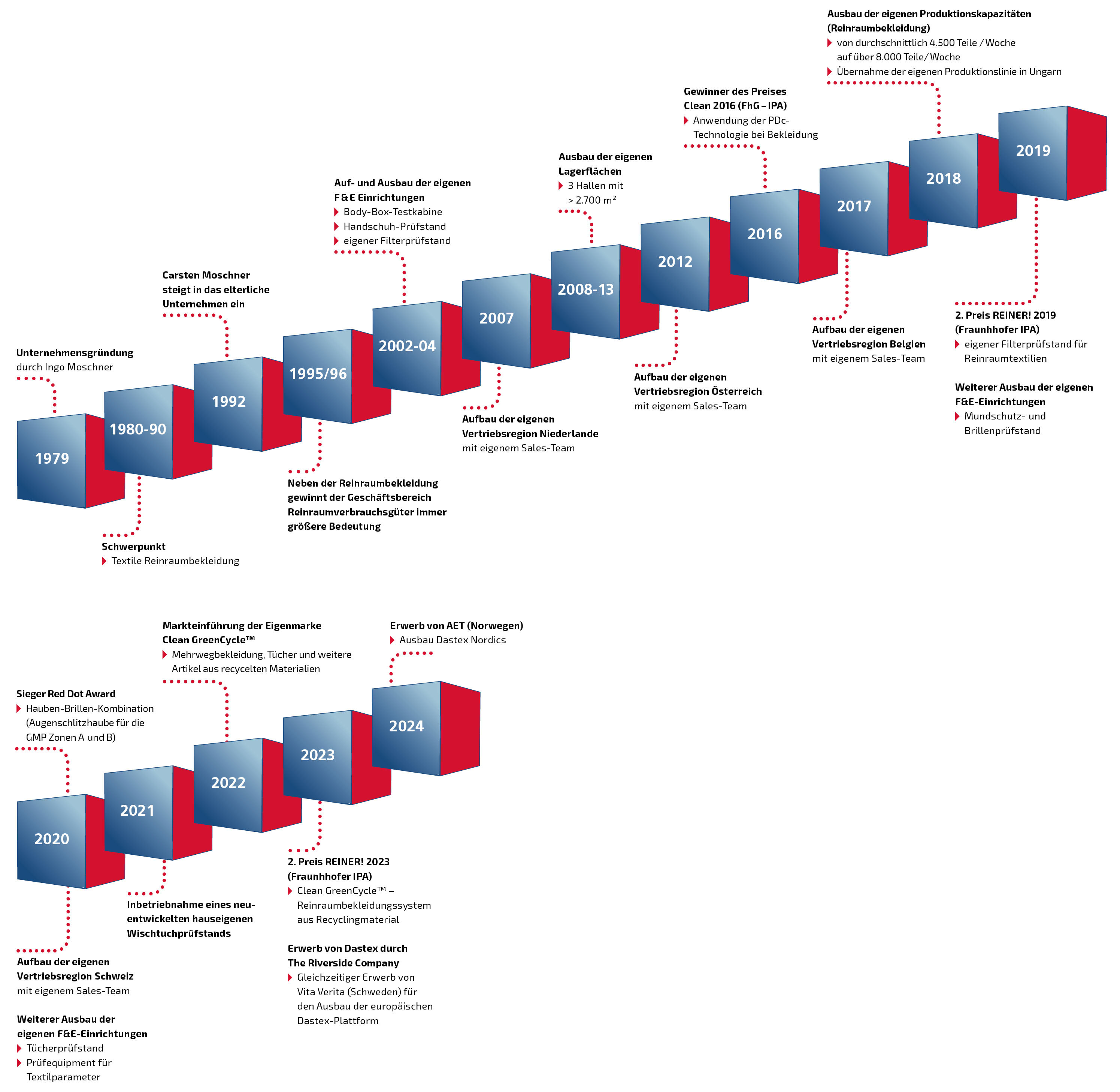 Dastex startete 1979 als reines Handelsunternehmen in einer damals noch sehr jungen Branche. Die ersten Produkte wurden hauptsächlich aus Japan und den USA bezogen und an Reinraumkunden im deutschsprachigen Raum verkauft. Es wurde jedoch schnell klar, dass eine Anpassung an europäische Standards notwendig war, was uns veranlasste, speziell die Fertigung von Mehrweg-Reinraumbekleidung selbst zu übernehmen.